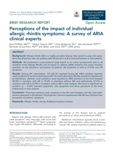 Results Among 401 respondents, 155 (38.7%) reported having AR. ARIA members reported nasal symptoms to be the most frequent (89.7%) and bothersome (80.0%) symptoms experienced by themselves. Likewise, nasal symptoms were reported by ARIA members as the most frequent (94.8% in members with AR vs 96.0% in members without AR) and bothersome (57.0% in members with AR vs 67.9% in members without AR) in their patients. We found a significant association (p = 0.001) between physicians’ own symptoms and those perceived as the most bothersome in their patients.