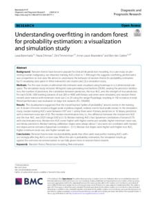Results: The visualizations suggested that the model learned “spikes of probability” around events in the training set. A cluster of events created a bigger peak or plateau (signal), isolated events local peaks (noise). In the simulation study, median training AUCs were between 0.97 and 1 unless there were 4 binary predictors or 16 binary predictors with a minimum node size of 20. The median discrimination loss, i.e., the difference between the median test AUC and the true AUC, was 0.025 (range 0.00 to 0.13). Median training AUCs had Spearman correlations of around 0.70 with discrimination loss. Median test AUCs were higher with higher events per variable, higher minimum node size, and binary predictors. Median training calibration slopes were always above 1 and were not correlated with median test slopes across scenarios (Spearman correlation − 0.11). Median test slopes were higher with higher true AUC, higher minimum node size, and higher sample size.