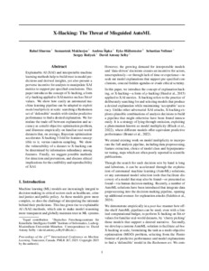 Explainable AI (XAI) and interpretable machine learning methods help to build trust in model predictions and derived insights, yet also present a perverse incentive for analysts to manipulate XAI metrics to support pre-specified conclusions. This paper introduces the concept of X-hacking, a form of p-hacking applied to XAI metrics such as Shap values. We show how easily an automated machine learning pipeline can be adapted to exploit model multiplicity at scale: searching a set of ‘defensible’ models with similar predictive performance to find a desired explanation. We formulate the trade-off between explanation and accuracy as a multi-objective optimisation problem, and illustrate empirically on familiar real-world datasets that, on average, Bayesian optimisation accelerates X-hacking 3-fold for features susceptible to it, versus random sampling. We show the vulnerability of a dataset to X-hacking can be determined by information redundancy among features. Finally, we suggest possible methods for detection and prevention, and discuss ethical implications for the credibility and reproducibility of XAI.