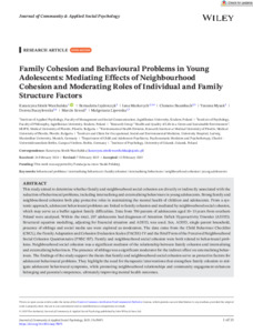 This study aimed to determine whether family and neighbourhood social cohesion are directly or indirectly associated with thereduction of behavioural problems, including internalising and externalising behaviours in young adolescents. Strong family andneighbourhood cohesion both play protective roles in maintaining the mental health of children and adolescents. From a systemic approach, adolescent behavioural problems are linked to family cohesion and mediated by neighbourhood social cohesion,which may serve as a buffer against family difficulties. Data from 700 parents of adolescents aged 10–13 years from southernPoland were analysed. Within the total, 207 adolescents had diagnoses of Attention Deficit Hyperactivity Disorder (ADHD).Structural equation modelling, adjusting for financial situation and ADHD, was used. Sex, ADHD, single-parent household,presence of siblings and social media use were explored as moderators. The data come from the Child Behaviour Checklist(CBCL), the Family Adaptation and Cohesion Evaluation Scales (FACES)-IV and the Brief Form of the Perceived NeighbourhoodSocial Cohesion Questionnaire (PNSC-BF). Family and neighbourhood social cohesion were both related to behavioural prob-lems. Neighbourhood social cohesion was a significant mediator of the relationship between family cohesion and internalisingand externalising behaviours. The presence of siblings was a significant moderator for the indirect effect on externalising behav-iours. The findings of the study support the thesis that family and neighbourhood social cohesion serve as protective factors foradolescent behavioural problems. They highlight the need for therapeutic interventions that strengthen family cohesion to mit-igate adolescent behavioural symptoms, while promoting neighbourhood relationships and community engagement enhancesbelonging and parental competence, ultimately improving mental health outcomes.