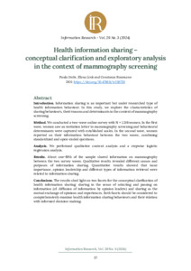 Introduction. Information sharing is an important but under researched type of health information behaviour. In this study, we explore the characteristics of sharing behaviours, their reasons and determinants in the context of mammography screening. Method. We conducted a two-wave online survey with N = 1,136 women. In the first wave, women saw an invitation letter to mammography screening and behavioural determinants were captured with established scales. In the second wave, women reported on their information behaviour between the two waves, combining standardized and open-ended questions. Analysis. We performed qualitative content analysis and a stepwise logistic regression analysis. Results. About one-fifth of the sample shared information on mammography between the two survey waves. Qualitative results revealed different causes and purposes of information sharing. Quantitative results showed that issue importance, opinion leadership and different types of information retrieval were related to information sharing. Conclusions. The results shed light on two facets for the conceptual clarification of health information sharing: sharing in the sense of selecting and passing on information (cf. diffusion of information by opinion leaders) and sharing as the mutual exchange of opinions and experiences. Both facets should be considered to comprehensively examine health information sharing behaviours and their relation with informed decision-making.