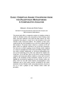 The present study offers a comparative analysis of colophons written in Arabic by Christian scribes at the monasteries of Saint Chariton, Saint Sabas, and Saint Catherine in the ninth and tenth centuries CE. These monasteries have played a crucial role in the formation of the early Christian Arabic manuscript tradition. The colophons of these manuscripts provide the most immediate access to the socio-cultural milieu of their producers. The present study is based on a selection of 20 colophons, which are explicitly connected to one of the three monasteries.