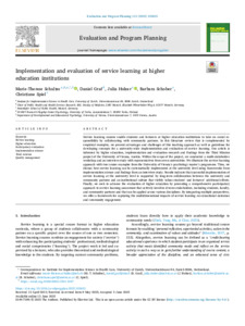 Service learning courses enable students and lecturers at higher education institutions to take on social responsibility by collaborating with community partners. In this literature review that is complemented by empirical examples, we present advantages and challenges of this teaching approach as well as guidelines for developing concepts for a university-wide implementation and evaluation of service learning. Our article is informed by higher education, implementation and evaluation research and findings from the Third Mission project of the University of Vienna, Austria. Within the scope of the project, we conducted a multi-stakeholder workshop and an interview study with representatives from seven universities. We illustrate the service learning approach with two course examples from the University of Vienna's psychology master's programme. Then, we discuss how service learning can be systematically implemented at the university level using frameworks from implementation science and findings from an interview study. Results indicate that successful implementation of service learning at the university level is supported by long-term collaboration between the university and community partners and an institutional culture that visibly values students' and lecturers' additional efforts. Finally, we seek to advance the evaluation of higher education by presenting a comprehensive participatory approach to service learning assessment that actively involves diverse stakeholders, including students, faculty, and community partners and that can be applied across various disciplines. By integrating multiple perspectives, we offer a framework for capturing the multidimensional impacts of service learning on educational outcomes and community engagement.